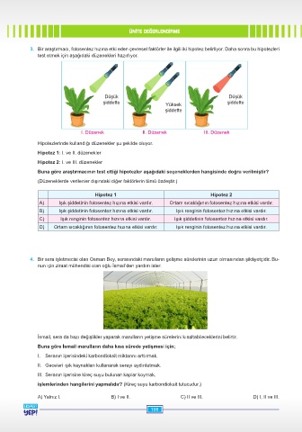 3. Bir araştırmacı, fotosentez hızına etki eden çevresel faktörler ile ilgili iki hipotez belirliyor. Daha sonra bu hipotezleri