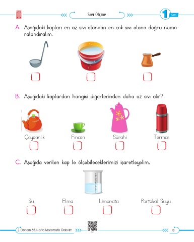 A. Aşağıdaki kapları en az sıvı alandan en çok sıvı alana doğru numa-
