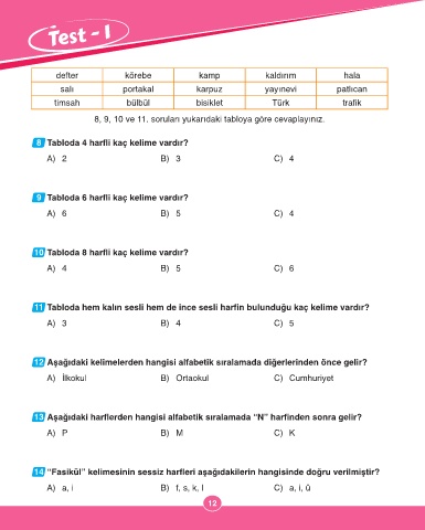 12 Aşağıdaki kelimelerden hangisi alfabetik sıralamada diğerlerinden önce gelir?