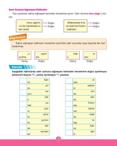 Aşağıdaki tablolarda satır sonuna sığmayan kelimeler hecelerine doğru ayrılmışsa
