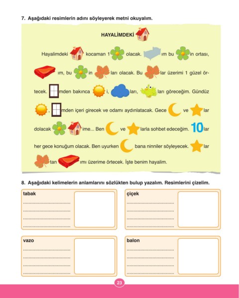 7. Aşağıdaki resimlerin adını söyleyerek metni okuyalım.