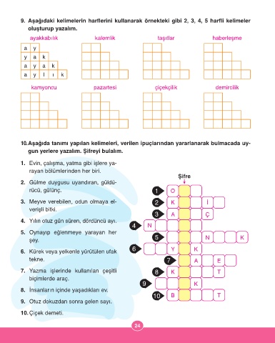 10. Aşağıda tanımı yapılan kelimeleri, verilen ipuçlarından yararlanarak bulmacada uy-