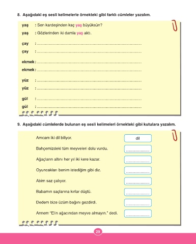 8. Aşağıdaki eş sesli kelimelerle örnekteki gibi farklı cümleler yazalım.