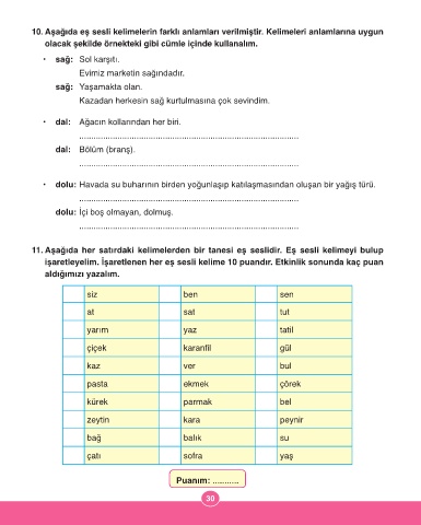 işaretleyelim. İşaretlenen her eş sesli kelime 10 puandır. Etkinlik sonunda kaç puan