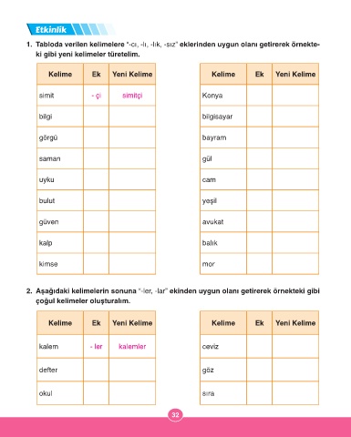 1. Tabloda verilen kelimelere “-cı, -lı, -lık, -sız” eklerinden uygun olanı getirerek örnekte-