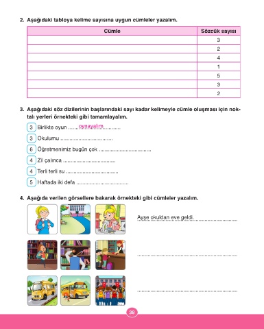 2. Aşağıdaki tabloya kelime sayısına uygun cümleler yazalım.