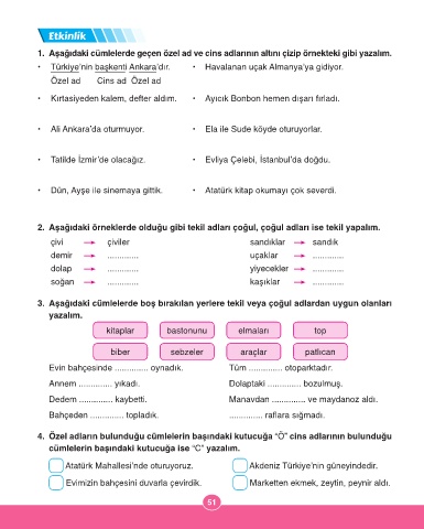1. Aşağıdaki cümlelerde geçen özel ad ve cins adlarının altını çizip örnekteki gibi yazalım.