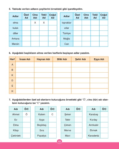 5. Tabloda verilen adların çeşitlerini örnekteki gibi işaretleyelim.