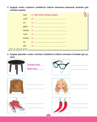 5. Aşağıda verilen varlıkların özelliklerini bildiren kelimeleri kullanarak örnekteki gibi