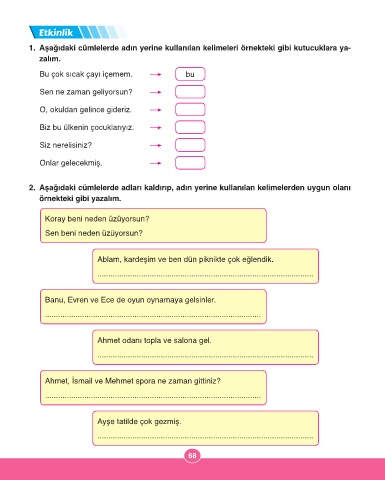 1. Aşağıdaki cümlelerde adın yerine kullanılan kelimeleri örnekteki gibi kutucuklara ya-