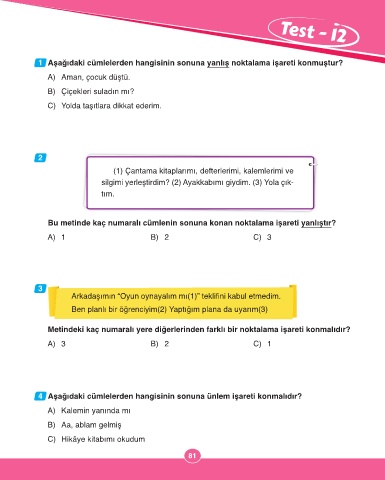 1 Aşağıdaki cümlelerden hangisinin sonuna yanlış noktalama işareti konmuştur?