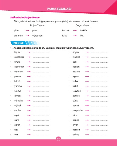 1. Aşağıdaki kelimelerin doğru yazımını imla kılavuzundan bulup yazalım.