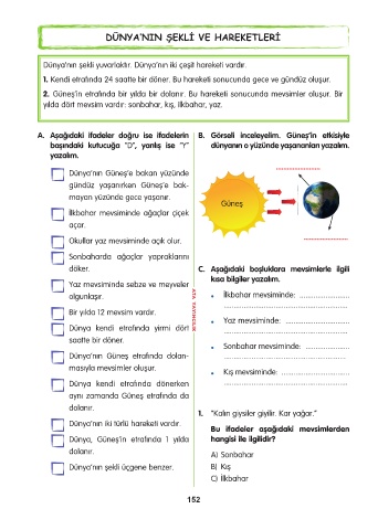 2. Güneş’in etrafında bir yılda bir dolanır. Bu hareketi sonucunda mevsimler oluşur. Bir