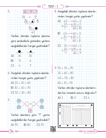 5. 26 + 17 = ? 8. Aşağıdaki zihinden toplama işlemle-
