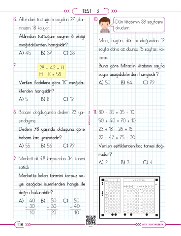 7. 28 + 42 = H Buna göre Miraç’ın kitabının sayfa