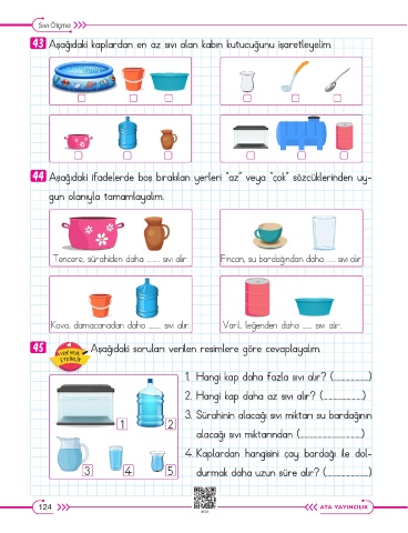 43 Aşağıdaki kaplardan en az sıvı alan kabın kutucuğunu işaretleyelim.