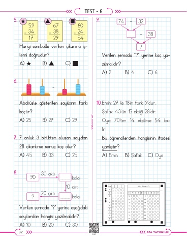 Abaküsle gösterilen sayıların farkı 10. Emin: 27 ile 18’in farkı 9’dur.