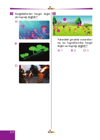 19 Aşağıdakilerden hangisi doğal 20 ışık kaynağı değildir? 1 A) 3 2 Yukarıdaki görselde numaralan- B) mış ses kaynaklarından hangisi doğal ses kaynağı değildir? A) 1 B) 2 C) 3 C) 228