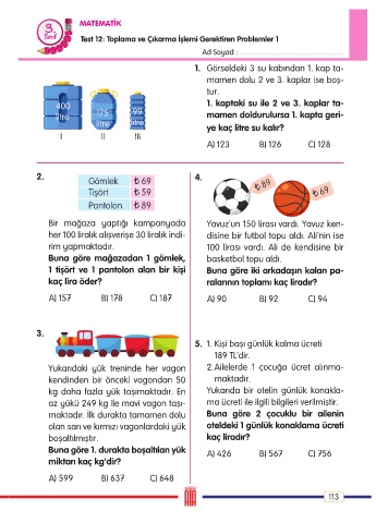 Test 12: Toplama ve Çıkarma İşlemi Gerektiren Problemler 1