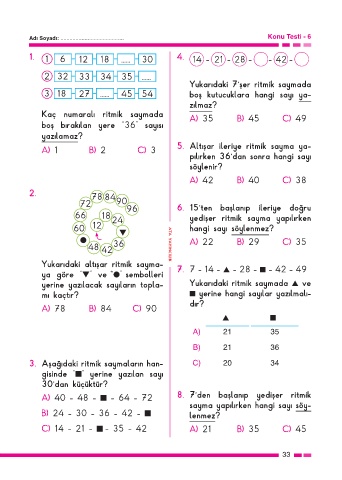 A) 40 - 48 - ■ - 64 - 72 8. 7’den başlanıp yedişer ritmik