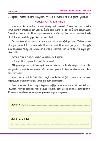 Aşağıdaki metni iki kere okuyalım. Metnin konusunu ve ana fikrini yazalım.