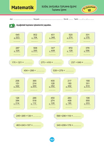 Matematik DOĞAL SAYILARLA TOPLAMA İŞLEMI Ev Çalışmam