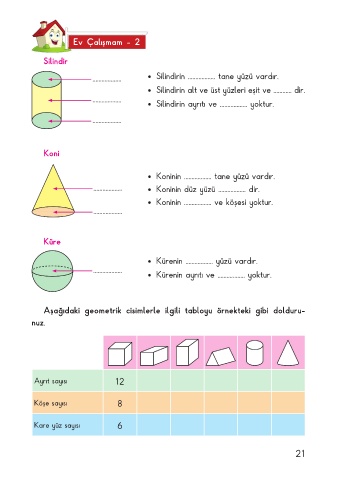 Aşağıdaki geometrik cisimlerle ilgili tabloyu örnekteki gibi dolduru-