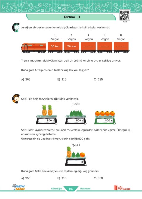 1 Aşağıda bir trenin vagonlarındaki yük miktarı ile ilgili bilgiler verilmiştir.