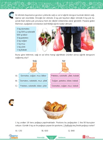 Buna göre Mehmet, sağ ve sol eline hangi ağırlıktaki ürünleri alırsa ağırlık dengesini