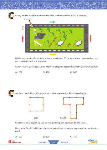 Dikdörtgen şeklindeki yürüyüş yolunun kısa kenarı 50 m, uzun kenar uzunluğu kısa ke-
