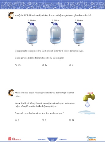 3 Aşağıda 5 L’lik bidonların içinde kaç litre su olduğunu gösteren görseller verilmiştir.