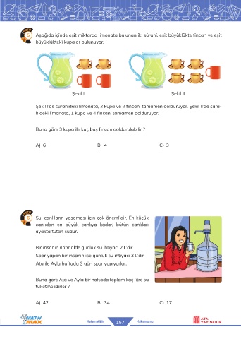 5 Aşağıda içinde eşit miktarda limonata bulunan iki sürahi, eşit büyüklükte fincan ve eşit