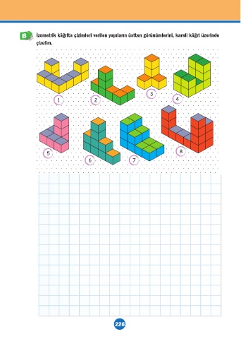 İzometrik kâğıtta çizimleri verilen yapıların üstten görünümlerini, kareli kâğıt üzerinde çizelim. 3 1 2 4 5 8 6 7 226