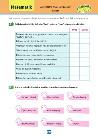 Aşağıda verilenlerden düzlem modeline örnek olanların yıldızını boyayalım.