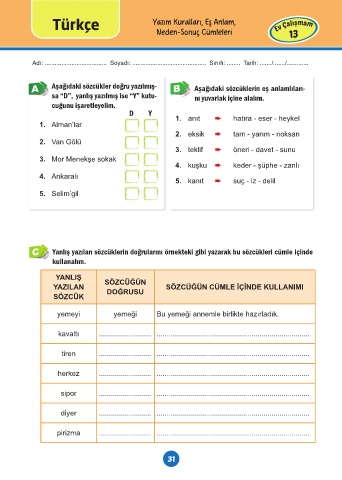 Türkçe Yazım Kuralları, Eş Anlam, Ev Çalışmam