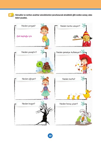 Görseller ve verilen anahtar sözcüklerden yararlanarak örnekteki gibi neden-sonuç cüm- leleri yazalım. 32
