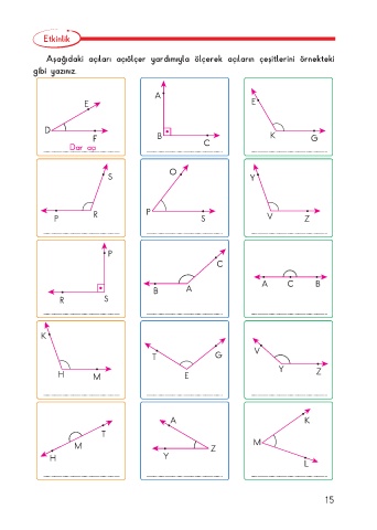 Aşağıdaki açıları açıölçer yardımıyla ölçerek açıların çeşitlerini örnekteki