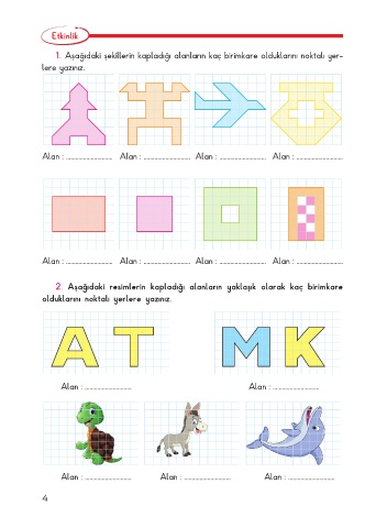 1. Aşağıdaki şekillerin kapladığı alanların kaç birimkare olduklarını noktalı yer-