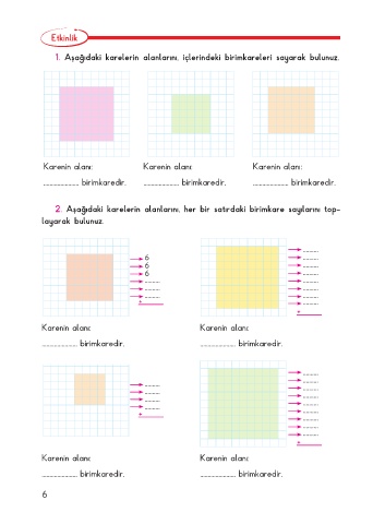 1. Aşağıdaki karelerin alanlarını, içlerindeki birimkareleri sayarak bulunuz.