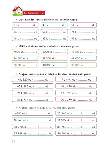 ✓ Litre cinsinden verilen çoklukları mL cinsinden yazınız.