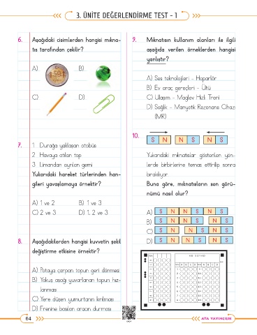 6. Aşağıdaki cisimlerden hangisi mıkna- 9. Mıknatısın kullanım alanları ile ilgili