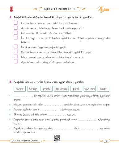 A. Aşağıdaki ifadeler doğru ise başındaki kutuya “D”, yanlış ise “Y” yazalım.