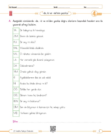 A. Aşağıdaki cümlelerde -de, -ki ve mi’den yazılışı doğru olanların başındaki heceleri sıra ile