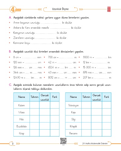 A. Aşağıdaki cümlelerde noktalı yerlere uygun ölçme birimlerini yazalım.