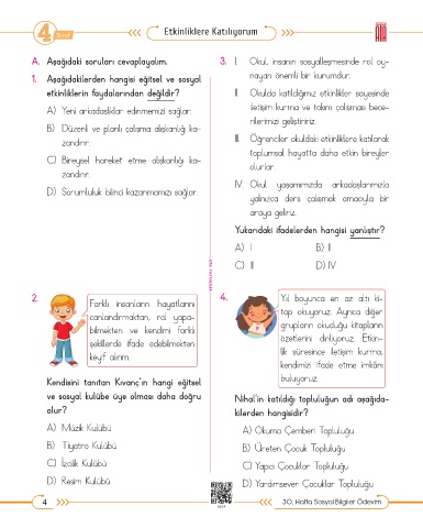 A. Aşağıdaki soruları cevaplayalım. 3. I. Okul, insanın sosyalleşmesinde rol oy-