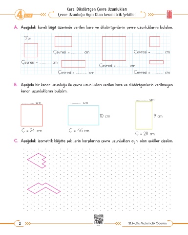B. Aşağıda bir kenar uzunluğu ile çevre uzunlukları verilen kare ve dikdörtgenlerin verilmeyen