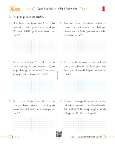 1. Uzun kenarı kısa kenarından 9 cm daha 4. Kısa kenarı 12 cm, uzun kenarı ise kısa ke-