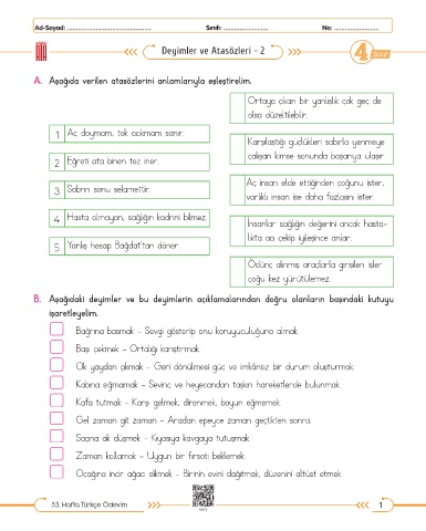 A. Aşağıda verilen atasözlerini anlamlarıyla eşleştirelim.