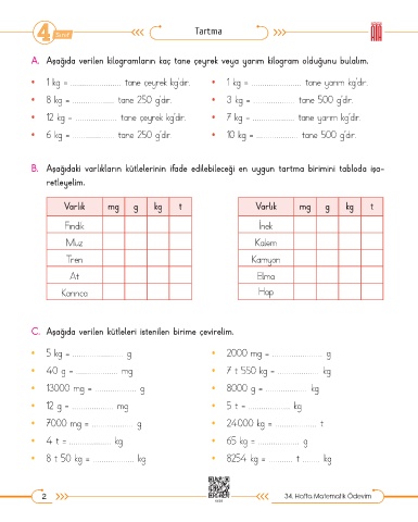 • 1 kg = ....................... tane çeyrek kg’dır. • 1 kg = ....................... tane yarım kg’dır.