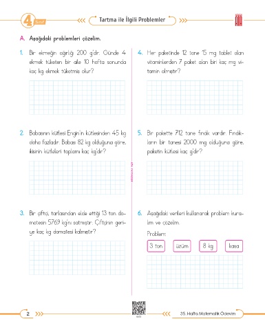 3. Bir çiftçi, tarlasından elde ettiği 13 ton do- 6. Aşağıdaki verileri kullanarak problem kura-